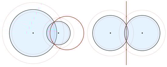 This 2-disk system is a Vietoris–Rips system and also a Čech system. In this case, we have , and, in actuality, the -rescaled 2-disk system  (center picture) has an empty intersection, i.e., , so it corresponds to a Vietoris Rips system which is not a Čech system. For such 2-disk system, theCech.scalealgorithm in Section 5 yields to  and the Čech system  is shown in the right picture.