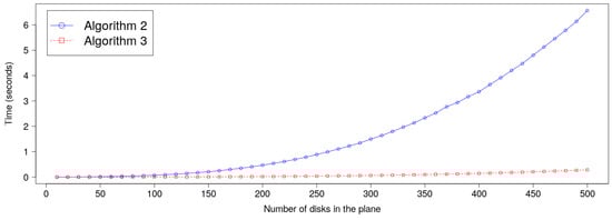 All our timings were done on a 64-bit GNU/Linux machine with two Intel Xeon processors (3.40 GHz), although our script were not threaded and only one core was used per process. We measured all the timings withclock()from the Standard C library. The average times in both graphics (Figure 7 and Figure 10) are the mean times for  repetitions of each algorithm, for every number of disks multiple of 10 in Figure 7 from 10 to 500, and for every dimension multiple of 200 in Figure 10 from 200 to 10,000.