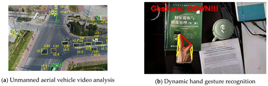 Visual object tracking, as an important research field of computer vision, is a fundamental part of many computer vision systems, such as military navigation, human–computer interaction, unmanned aerial vehicle video analysis, dynamic behavioral recognition, intelligent medical treatment, and so on (see Figure 1) [1,2,3]. Given the location and extent of an arbitrary object, the task of visual object tracking is to determine the object’s location with the best possible accuracy in the following frames [4].