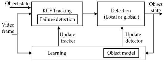 In this study, we optimized two aspects of the TLD: the tracking module and the detection module. A block diagram of the proposed algorithm is shown in Figure 2. The KCF tracker based on HOG was used to implement the tracking module. Failure detection was added for the response of KCF to identify if it fails to track the object correctly. As for the detection module, the detection strategy was adjusted based on the estimated object location provided by the tracking module. The detection module only needs to detect the scanning windows that are near the estimated location, so as to reduce the calculation and improve the tracking speed. If the tracking module loses the object, then the detection module detects the target in a full frame.