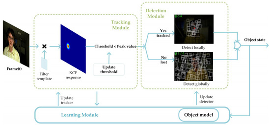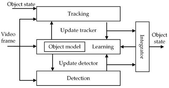Many researchers have shown great interest in visual object tracking and have proposed various trackers. For example, mean shift is a classical tracking algorithm. On the basis of the mean shift iterations, the most probable location of an object in a frame is found [7]. Particle-filtering-based trackers establish a certain model for objects and determine an object’s location by calculating the similarity between the particles and the target [12]. Correlation-filtering-based trackers show great advantages in tracking speed; these include the circulant structure kernel (CSK) tracker, the kernelized correlation filter (KCF) tracker, and the discriminative scale space tracker (DSST) [12]. As the performance of computers improve, deep learning has been applied to the field of computer vision. For example, Siamese and end-to-end networks have been widely used for tracking [13,14]. Among these trackers, the tracking–learning–detection (TLD) tracker proposed by Kalal et al. [15] introduced a novel tracking framework to solve the tracking problem. By combining a detector and a tracker with an online learning module, experiments showed that it performs well in long-term tracking. However, there are still some shortcomings that influence its actual application. The target is easily lost when the object is deformed or blurred. Further, the calculation is complicated, resulting in slow tracking speed.