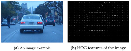 HOG is proposed to describe visual objects robustly, based on calculating well-normalized local histograms of image gradient orientations in a dense grid, as shown in Figure 7. To obtain the HOG of an object, the visual object is primarily divided into small connected regions called cell units. Then, the gradient or edge direction of each pixel is calculated in the unit. Finally, the collected histogram information is combined to obtain the HOG descriptors [9]. The following equations relate to the calculation of the pixel gradient: