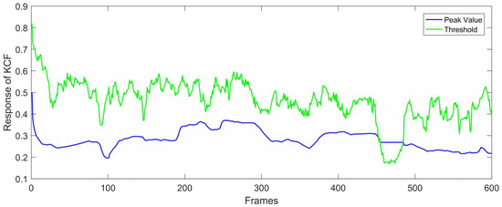 Secondly, the failure detection is appended before the KCF tracker outputs the location of the peak value in order to determine if the tracking module tracks the object correctly. The response of a location evaluates the similarity with the target. However, KCF cannot be aware of it and keeps tracking the bounding box in which the maximum response value is located. As a result, KCF may track the background, thus losing the target. In the failure detection, a dynamic threshold proposed by Liu [22] is set for the peak value of the response, and the equations are shown in Formula (6):