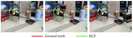 If the peak value of the response is smaller than the threshold, the location of the peak value is marked as not reliable. Therefore, KCF would not update its filter template nor post the location of the peak value to the detection module. Figure 8 and Figure 9 illustrate the function of the failure detection. According to Figure 8, peak values were lower than thresholds from the 460th frame to around the 490th frame. As shown in Figure 9, KCF did track the wrong object when thresholds were larger than the peak value. If KCF is judged to track incorrectly, the tracking module will not pass the location of the peak value to the detection module.