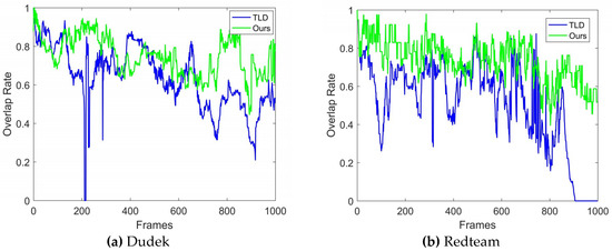 Experiments were conducted using several video sequences. Table 1 lists the results of four of the video sequences and includes the frames, AOR, and the growth rate of AOR. According to Table 1, the proposed algorithm showed better tracking accuracies. Figure 11 shows the results of the overlap rate in every frame in detail; the vertical axis shows the overlap rate and the horizontal axis represents the frame number. An OR of 0 means that the tracker lost the target. As can be seen from Figure 11, the overlap rate fluctuated during a video. The overlap rates of the proposed algorithm exceeded TLD in the majority of frames. Furthermore, the number of times the target was missed was reduced after the improvements were implemented.