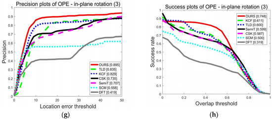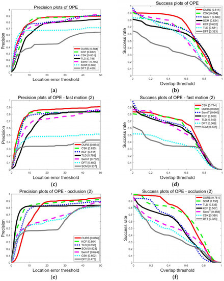 Quantitative analysis for the proposed algorithm was obtained based on the full benchmark OTB50. The precision curve and success rate curve were chosen to evaluate the performance of the trackers. The left part of Figure 13 shows the precision curves, and the x-axis is the center location error (CLE), the Euclidean distance between the center of the target box and the ground truth. A frame can be considered correctly tracked if the CLE is within a distance threshold. The precision curve shows the percentage of correctly tracked frames for a range of distance thresholds. In the legend of the precision curves, the value in the square brackets is the precision value at a location threshold of 20 pixels. Similarly, the success rate curve presents the percentage of correctly tracked frames for a range of overlap rates. In the legend of success plots, the value in the square brackets is the success rate value in the threshold of 0.5.