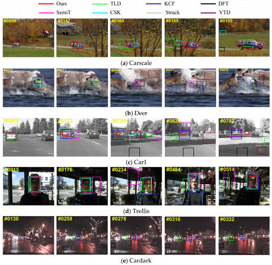 Qualitative comparisons were carried out to compare tracking performances in challenging scenes from these sequences. As can be seen from Figure 14a that when the object was blocked, TLD contained too much background in its bounding box, resulting in losing track of the target in the following frames. Due to the object model, TLD tracked the object again after occlusion disappeared. However, CSK and DFT failed to track the real target. Ours performed best in this sequence, tracking accurately even when occlusion was severe.