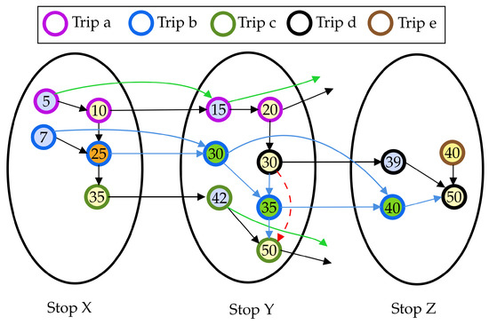 The graph-based models, instead, store the timetable as a suitable graph and execute known adaptations of Dijkstra’s shortest path algorithm to compute optimal routes [2,9,10,11]. Alternatives to both plain array-based and graph-based models have been also recently considered [12,13,14]. Some of them, like the one in Reference [12], directly operate on the timetable. In details, trips are labeled with the stops at which they are boarded and a precomputed list of transfers to other trips is scanned during a query. Newly reached trips are labeled and for a trip reaching a desired destination, a journey is added to the result set. The algorithm terminates only when all optimal journeys have been found.