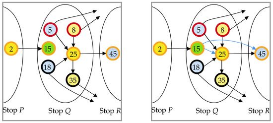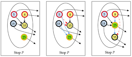 In order to obtain a very fast query time compatible with modern applications, in Reference [13] a customization of the general query approach, tailored for red-te graphs, was proposed. In particular, the main idea underlying the ptl query algorithm is to compact labels and to associate them to stops, rather than to vertices. To this aim, ptl builds a red-te (There is a one-to-one correspondence between red-te graphs and classic time–expanded graphs [2]) graph G, computes a 2hc-r labeling l of G, and compresses it into a set of stop labels sl of l [13]. In detail, we have a forward stop label sl and a backward stop label sl for each stop . A forward (backward, respectively) stop label is a list of pairs of the form where v is a hub vertex reachable from (that reaches, respectively) at least one vertex in dv[i] (av[i], respectively) and encodes the latest departure (earliest arrival, respectively) time from to reach hub vertex v (from the stop, say , of vertex v to reach , respectively).