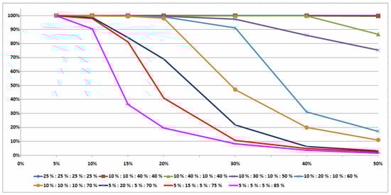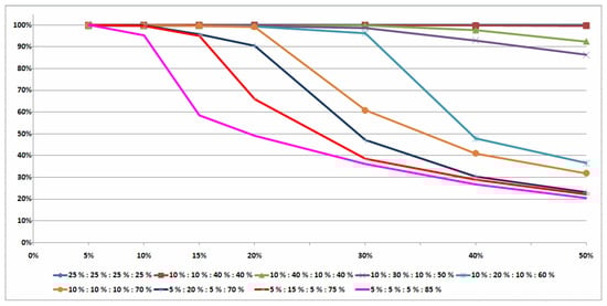 Reference [] addresses the total completion time objective in the flow-shop problem with uncertain durations of the jobs. A geometrical algorithm has been developed for solving the flow-shop problem with m machines and two jobs. For this problem with two or three machines, sufficient conditions are determined such that the transposition of two jobs minimizes . Reference [] is devoted to the case of separate setup times with the criterion of minimizing the makespan or total completion time. The job durations are fixed while each setup time is relaxed to be a distribution-free random variable within the given lower and upper bounds. Local and global dominance relations have been determined for the flow-shop problem with two machines.