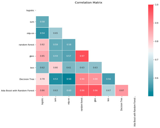 The literature on machine learning has generally revealed the superiority of ensemble algorithms for speech recognition. Ensemble learning algorithms are well-known for yielding high recognition accuracy provided appropriate features are used to train the algorithms [50]. However, we have observed that most of the ensemble algorithms reported in the literature to date are either computationally expensive or they produce almost the same recognition accuracies as most of the base learners are sometimes called inducers [46,51]. Hence, we have decided to develop a new ensemble algorithm using the statistical analysis of correlation of ROC AUC score to nominate the learning algorithms that would become part of the proposed RALOG ensemble algorithm. The learning algorithms used at this phase are decision tree, random decision forest, gradient boosting machine, logistic regression, multi-layer perceptron, support vector machine, k-nearest-neighbor, and AdaBoost with random forest. The correlation matrix computed using the ROC AUC scores of these learning algorithms is illustrated in Figure 4.