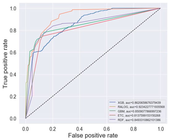 The approach of stacking ensemble was applied to develop the proposed RALOG ensemble algorithm using the mixtend package [52]. The package is a publicly available library of useful python tools for developing ensemble learning algorithms. The AdaBoost with random forest was used as a meta-learner for RALOG because it has yielded a high score in the correlation matrix. Logistic regression, decision tree, random decision forest, gradient boosting machine, and AdaBoost with random forest were the experimental learning algorithms for RALOG. They have high total correlation scores and are chosen based on the correlation matrix shown in Figure 4. The architecture of the RALOG stacked ensemble algorithm is illustrated in Figure 5.