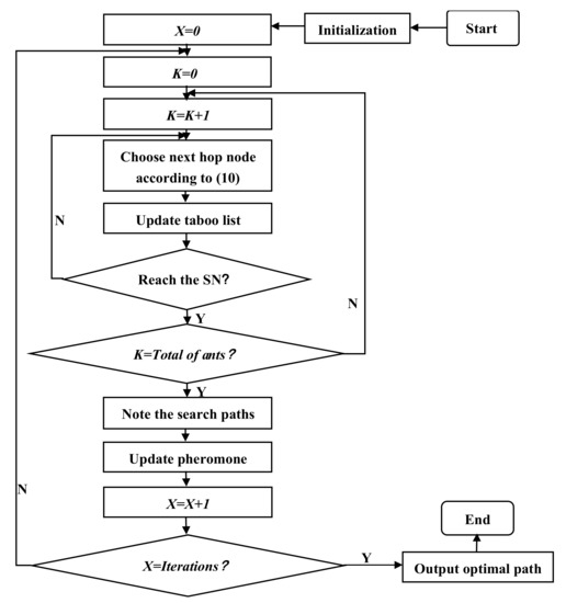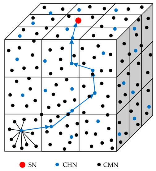 It is noted that only one CHN finds its optimal path to the SN after Step 6, and the number of CHNs is equal to the number of small cubes in the network. Hence, by changing the IDs of the source nodes and repeating the whole process of the ACO algorithm, the paths from the other CHNs to the SN can be determined. In this paper, the destination node is always the SN and the CHNs that need to send data packets become the source nodes. The relay nodes on multi-hop paths are other CHNs. Furthermore, the search process for the optimal multi-hop routing paths is accomplished in the SN because it has a continuous energy supply. After the CHNs are selected, they send the SN messages with information such as IDs, locations, and residual energy so that the SN can figure out the optimal paths by using the improved ACO and then transmit the routing information to the CHNs.