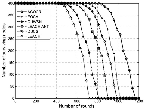 Figure 4 shows the number of surviving nodes versus the number of rounds for the proposed algorithm and reference algorithms when 400 nodes were considered in the network, from which we can see that the number of surviving nodes decreases with the increase in the network rounds no matter which algorithm is used. However, by using the proposed ACOCR, the network always has the largest number of surviving nodes.