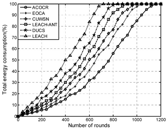 Figure 6 illustrates the total energy consumption versus the number of rounds for the six algorithms when 400 nodes were considered in the network, from which we can see that the total energy consumption rises with the increase in the network rounds regardless of which algorithm is used. However, the proposed ACOCR algorithm is the most efficient one in reducing the energy consumption. For example, in round 600, the total consumed energy of the ACOCR, EOCA, CUWSN, LEACH-ANT, DUCS, and LEACH accounts for 32.5%, 41.1%, 50.6%, 58.2%, 65.4%, and 83.8% of the initial energy of the network, respectively. As for the network energy that is completely consumed, the energy efficiency of the ACOCR is improved by 14.7%, 18.3%, 29.3%, 45.3%, and 65.2% compared to that of the EOCA, CUWSN, LEACH-ANT, DUCS, and LEACH, respectively. This is because the proposed ACOCR optimizes CHN selection and employs the optimal paths found by the improved ACO algorithm to transmit the data packets, thereby minimizing the energy consumption. The EOCA and the CUWSN outperform the LEACH, DUCS, and LEACH-ANT. However, both of them are inferior to the ACOCR, which is because neither of them optimizes the multi-hop paths for data transmission.