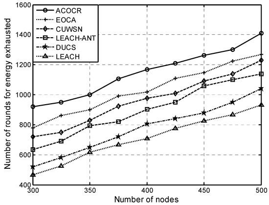 The number of rounds when energy is exhausted versus the number of nodes for the six algorithms.