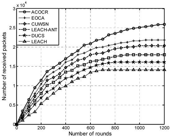 Figure 8 demonstrates the received packets by the SN versus the number of rounds for the six algorithms when 400 nodes were considered in the network. The more packets the SN receives, the more efficient the algorithm is. Apparently, the ACOCR algorithm has the best performance, the efficiency of which is 18.6%, 27.4%, 44.1%, 60.9%, and 84.1% higher than that of the EOCA, CUWSN, LEACH-ANT, DUCS, and LEACH, respectively, in round 1200.