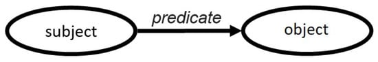 In 1999, as a part of the World Wide Web Consortium W3C, the Resource Description Framework (RDF) standard was developed, described on the W3C pages [,], and its model can be found in []. Taking this model as standard, knowledge representation in the semantic web can be formulated in the RDF marking language—this is a resource description model. Then, the resource is all that can be identified by subtitles in the URI language. One receives RDF documents—descriptions of resources and relationships between them, and also RDF diagrams—resource classes, types of relationships, and types of restrictions. The RDF model is a set of statements, identified with the semantic web, statements which have schemas of triples—node, edge, node—presented in Figure 1.