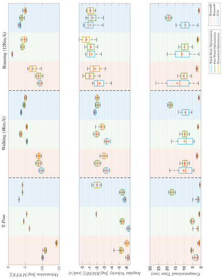 - Latella, C.; Lorenzini, M.; Lazzaroni, M.; Romano, F.; Traversaro, S.; Akhras, M.A.; Pucci, D.; Nori, F. Towards real-time whole-body human dynamics estimation through probabilistic sensor fusion algorithms. Auton. Robots 2019, 43, 1591–1603. [Google Scholar] [CrossRef]