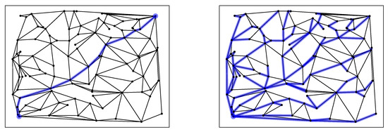 Variants of the single-source single-target shortest path problem have also been studied by Yen [16] and Bhandari [17]. Yen has proposed an algorithm for finding the K shortest s-t-paths, where K is a parameter supplied by the user. The method operates on graphs with nonnegative weights and starts by first identifying the shortest s-t-path. For , the ith shortest s-t-path is then determined by modifying the graph according to the first shortest s-t-paths and calculating the shortest s-t-path of this new graph. Using Dijkstra’s algorithm with a binary heap, this algorithm has a complexity of . The methods of Bhandari, meanwhile, are used to produce pairs of edge-disjoint s-t-paths in a graph. After determining the shortest s-t-path, modifications are made to the graph by deleting some edges of the path and negating the weight of others. A subsequent run of an appropriate shortest path algorithm then produces the desired second path. Similar techniques can also be used to produce vertex-disjoint paths [17].