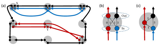 Examples of the Kirby–Potts expansion method are shown in Figure 3a,b. As illustrated, each cluster is composed of a set of “in-vertices” and “out-vertices”. Transfer penalties are specified using edges that start at the in-vertices and end at the out-vertices (forming a directed bipartite graph). This results in a new graph comprising vertices and edges, where