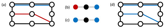 In more detail, consider a conflicts graph created using a single i-coloured vertex for each component of each subgraph (for ), with edges corresponding to any vertex pair representing differently-coloured overlapping components in . From a graph colouring perspective, note that the colours of the vertices in this conflicts graph define a proper k-colouring, in that pairs of adjacent vertices will always have different colours; however, it may be possible to colour this conflicts graph using fewer colours. If this is so, then an equivalent graph to G with fewer colours can also be created. An example of this process is shown in Figure 4. This illustrates that, while the number of different edge colours k could have any value up to and including m, the minimum number of colours needed to express this graph might well be smaller. However, identifying this minimum can be difficult since it is equivalent to solving the -hard chromatic number (graph colouring) problem [26].