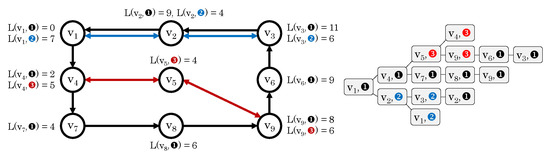 As shown in Algorithm 4, items are selected and removed from the priority queue Q on Lines 8 and 9. If the selected item refers to an in-label (), then only labels referring to the outgoing colours of vertex u need to be considered for update; hence, we only need to look at the transfer penalties for in which is not distinguished (Lines 12 to 15). Similarly, if refers to an out-label (), then we only need to consider updating the in-labels of any vertex v connected to u by an edge of colour i (Lines 18 to 21). This behaviour is identical to the way in which Dijkstra would operate with a Kirby–Potts expanded version of the graph.