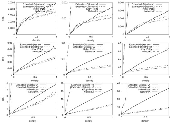 Figure 7 shows the average CPU times of our implementations using random graphs with and . In all cases, five graphs were generated for each density and algorithms were run using each of the n vertices as a source in turn. Each point in the figure is therefore a mean of different values. As an additional means of comparison, we also ran a second (slightly slower) implementation of Dijkstra’s algorithm on Kirby–Potts expanded graphs, available in the Python package NetworkX (v. 2.4).