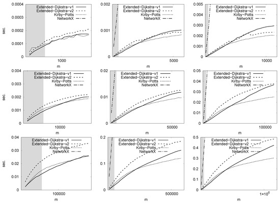Figure 7 also shows that the gap in the time requirements of Extended-Dijkstra-V1 compared to Kirby–Potts and Extended-Dijkstra-V2 widens for increases in n, k, and m. Indeed, the most extreme difference occurs with graphs with , , and , where a difference of over twenty seconds per shortest-path tree is observed. That said, the effects of the asymptotic growth rate intersections (as seen in Figure 6) are also apparent with small sparse graphs, where Extended-Dijkstra-V1 has slightly shorter running times.