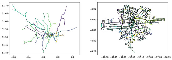 Public transport networks for the London Underground (left), and the city of Winnipeg (right). Vertices are positioned according to GPS coordinates.