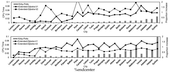 The charts in Figure 10 summarise the results with these instances. In the majority of cases, the use of Dijkstra’s algorithm with Kirby–Potts graphs gives the shortest average run times. Run times of our extended algorithms are therefore stated as a proportion of these times. (A proportion increase of one indicates a 100% increase in run time). As shown, when walks between access points are not included in the graphs, their relative sparsity allows Extended-Dijkstra-V1 to execute run more quickly than V2 in nearly all cases. However, once walks of up to 1 km are included, the increased density sees V2 running more quickly.