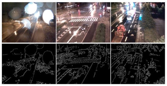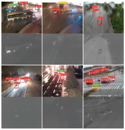 In recent years, with the development of computer vision, more and more algorithms are applied to the field of traffic surveillance [,,]. These methods improve the efficiency of road monitoring and let people get rid of boring and tedious work in front of the monitor []. However, it is well known that the application context plays an important role in practical applications of computer vision, as the conditions for the camera to capture images are not ideal sometimes, especially when the visibility of the scene is impaired by insufficient lighting or bad weather conditions such as rain, snow, haze and fog [], as shown in Figure 1. The efficiency and accuracy of identification in these conditions are greatly reduced, which is unacceptable for traffic surveillance. To solve this problem, we propose a neural network to process color and thermal images collected by surveillance equipment and to obtain information about the images. We know that the thermal image represents the difference in thermal radiation between the objects and the background, in other words, it describes the difference in temperature between the objects and the background, which is effective in all weather conditions. In contrast, the color image represents the visible light that is reflected or emitted from the object and background, it has high spatial resolution and sharp texture details []. Therefore, the fusion of these two complementary types of information can effectively improve the robustness of recognition, which is very helpful for object detection and tracking in some limitations caused by weather conditions [].