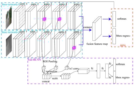 The architecture of dual input faster RCNN (D-F Net). It is a middle level feature fusion model.