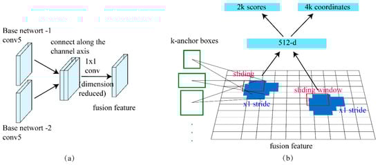 Different from the traditional faster RCNN network, our base convolutional network consists of two parts, the infrared image feature extract convolutional network (base network 1), and the visible image feature extract convolutional network (base network 2). In the base network, we use Inception ResNet [] to generate the initial feature map. In detail, we use fine-tuned ResNet-34 and ResNet-50 as base network 1 and base network 2, respectively. In order to reduce the number of weights, we adjusted the dimensions of ResNet-34 and ResNet-50, as shown in Table 1. In addition, base network 2 is pretrained on the ImageNet dataset, and base network 1 uses Xavier for weight initialization. After the convolution processing of the two images, the corresponding feature maps of the two images are obtained, and then the two feature maps are connected along the channel axis and computed with a 1 × 1 convolution to obtain the fusion feature map, as shown in Figure 3a. The region proposal network is used to generate proposals from the input 512-dimensional fusion feature maps extracted by convolutional base, as shown in Figure 3b.