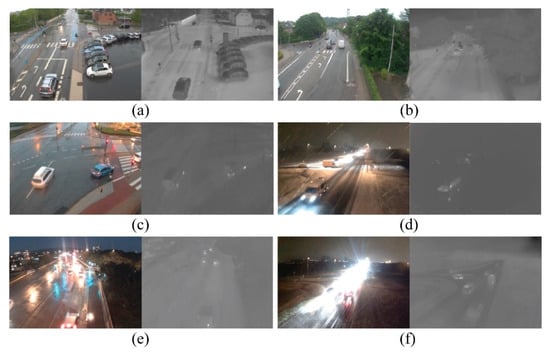 Some examples of images of traffic surveillance, the visible image is on the left and the infrared image is on the right. In (a–c), there are scenes ranging from sunny to rainy in the daytime; in (d–f), there are bad lighting conditions and bad visibility of the scenes; (c) snow; (d) rain and reflections; (f) raindrops on the camera lens.