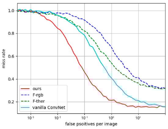 Figure 5 shows the curve of the miss rate and false positives per image under all-weather conditions of the four models, where the miss rate is the number of objects not recognized by the detector divided by the total number of ground truth and the false positives (FPs) are those negative samples identified by the detector as positive samples. It can be seen from the figure that neither single spectral recognizer is as effective as the fused recognizer. Their miss rate and FPs per image are high in most cases, and the comparison of the two fused recognizers shows that our method is an improvement over vanilla ConvNet. The reason why we use vanilla ConvNet as a comparison here is that it performs better in the fusion detector, especially for pedestrian recognition [].