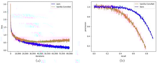 D-F Net performance compared with the vanilla ConvNet: (a) Loss function curve of 80,000 iterations; (b) precision–recall curve.