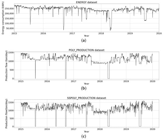 The data used in this study was sourced from the Brazilian subsidiary of an international thermoplastic resin manufacturer, an energy-intensive manufacturing plant. The plant size is c. 55,000 m2 with a production capacity of approximately 500,000 tons per year. Currently, the case site calculates energy consumption forecasts manually and prepares a technical energy consumption index (TECI) as a proxy for energy efficiency. Five years of data from 1 January 2015 to 31 December 2019 for daily total energy consumption at the plant (ENERGY dataset) as well as process-related data for two different stages of the manufacturing process—polymerisation (POLY_PRODUCTION dataset) and solid-state polymerisation (SSPOLY_PRODUCTION dataset)—were provided. Each dataset comprised 1826 values. Figure 1 presents the time series of the three datasets used in this work.