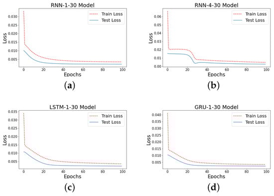 Convergence results for (a) Recurrent Neural Network (RNN)-1-30, (b) RNN-4-30, (c) Long Short-Term Memory (LSTM)-1-30, and (d) Gated Recurrent Unit (GRU)-1-30.