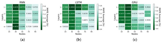 Mean absolute percent error (MAPE) grid search result for (a) simple RNN, (b) LSTM, and (c) GRU.