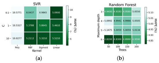 MAPE grid search result for (a) SVR and (b) Random Forest.