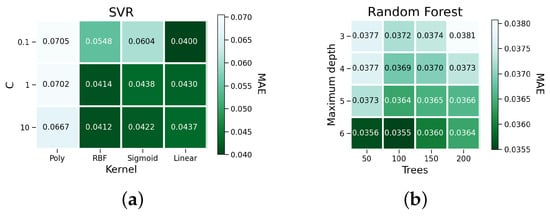 MAE grid search result for (a) SVR and (b) Random Forest.