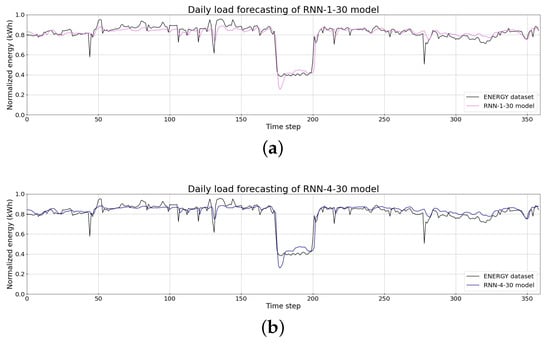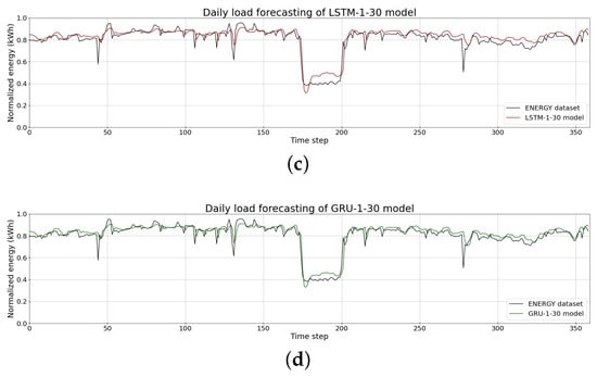 Daily load forecasting using (a) the RNN-1-30 model, (b) the RNN-4-30 model, (c) the LSTM-1-30 model, and (d) the GRU-1-30 model.