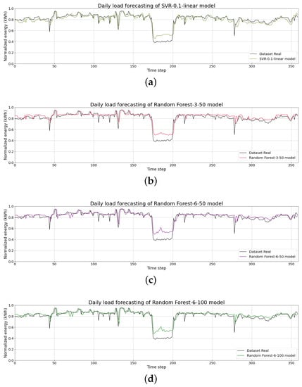 Daily load forecasting using (a) the SVR-0.1-linear model, (b) the Random Forest-3-50 model, (c) the Random Forest-6-50 model, and (d) the Random Forest-6-100 model.