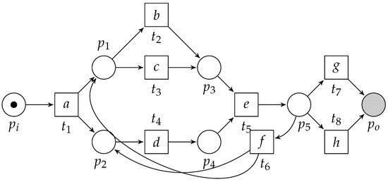 Workflow nets (WF-nets) [15] extend the more general notion of Petri nets [16]. A Petri net is a directed bipartite graph containing two types of vertices, i.e., places and transitions. We visualize places as circles, whereas we visualize transitions as boxes. Places only connect to transitions and vice versa. Consider Figure 3, depicting an example Petri net (which is also a WF-net). We let denote a labeled Petri net, where, P denotes a set of places, T denotes a set of transitions and represents the arcs. Furthermore, given a set of labels and the symbol , is the net’s labelling function, e.g., in Figure 3, , , etc. Given an element , denotes the pre-set of x, whereas denotes its post-set, e.g., in Figure 3, and . We lift the •-notation to the level of sets, i.e., given , and . Let be a Petri net and let , and . The Petri net is a subnet of N, written . In the context of this paper, we refer to a subnet as a fragment if it is weakly connected. Furthermore, a fragment is place-bordered iff the only vertices of (i.e., members of ) that are connected to vertices that do not belong to (i.e., members of ) are places, i.e., . Furthermore, we refer to and to the input and output places of the place-bordered fragment. For example, in Figure 3, the subnet formed by places , , , , , transitions , , , and the arcs is a place-bordered fragment. Observe that, if we remove place (and the corresponding arc ), the subnet is still a fragment, yet, no longer place-bordered. If we also remove and the arcs and , the subnet is not a fragment as it is no longer weakly connected. We let denote the universe of Petri nets.