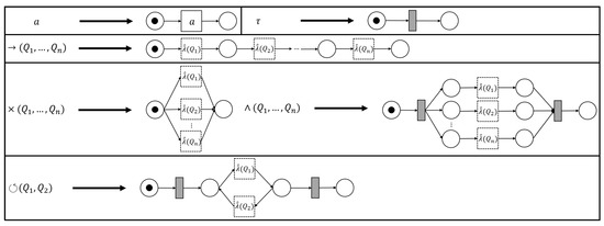 Given an arbitrary process tree , there are several ways to translate it to a sound WF-net W, s.t., , i.e., instantiating and . As an example, consider the translation functions, depicted in Figure 5.