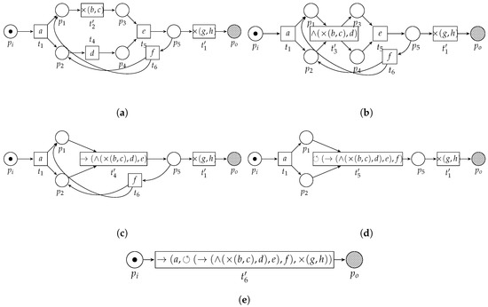Application of the algorithm on the running example, i.e., . The label of , i.e., , depicted in Figure 6e, is the resulting process tree. The resulting process tree, i.e., , is equal to Figure 4. (a) Result of the first two rounds of the algorithm. The first two patterns that can be found are choice constructs, between b and c and between g and h, respectively. (b) Result of the third round of the algorithm on the running example. We find a concurrent construct between transition and . (c) Result of the fourth round of the algorithm. We find a sequential construct. (d) Result of the fifth round of the algorithm. We find a loop construct. (e) Result of the final round of the algorithm. We find a sequence construct.