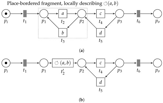 Observe that any place-bordered fragment of a WF-net that describes the same local language as its corresponding process tree representation is a feasible pattern. As such, any feasible pattern is locally language-preserving. Transforming such a detected pattern within the given WF-net is straightforward, i.e., we add a new transition to the WF-net with label and pre-set and post-set . For example, consider the reduction of the choice construct between transitions and of Figure 3, i.e., depicted in Figure 6a, in which places and serve as the pre- and post-set of the newly added transition with label . We formally define the notion of feasible pattern reduction as follows.