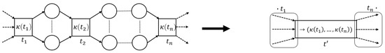 Schematic visualization of the →-pattern reduction (dashed arcs are allowed to be part of the pattern, solid arcs are required). The post-set of each transition acts as the pre-set of (). The transition replacing the identified pattern inherits and (these corresponding places are not explicitly visualized in this figure). The label of is formed by the sequence operator defined on top of the labels of , respectively.