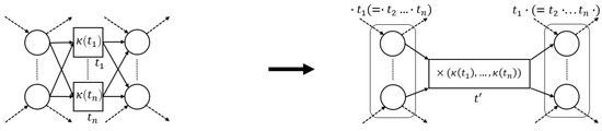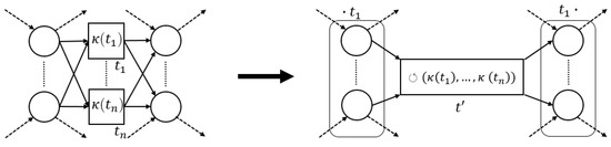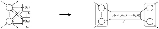 The →-operator, i.e., , describes sequential behavior, hence, any subnet describing strictly sequential behavior, describes the same language. If a transition always, uniquely, enables transition , which in turn enables transition , and, whenever has fired, the only way to consume all tokens from is by means of firing , and, similarly, the only way to consume all tokens from is by means of firing , etc.; then, are in a sequential relation. We visualize the →-pattern in the left-hand side of Figure 9. Note that, in the visualization, we omit and , respectively, i.e., and .